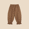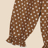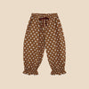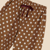 Playful and refined, the Lady Pants Celia are crafted in soft cotton poplin with a warm caramel base and ivory polka dots. Featuring an elastic waistband with a contrasting burgundy velvet ribbon and delicate ruffled hems, they combine comfort with a romantic, vintage-inspired touch.