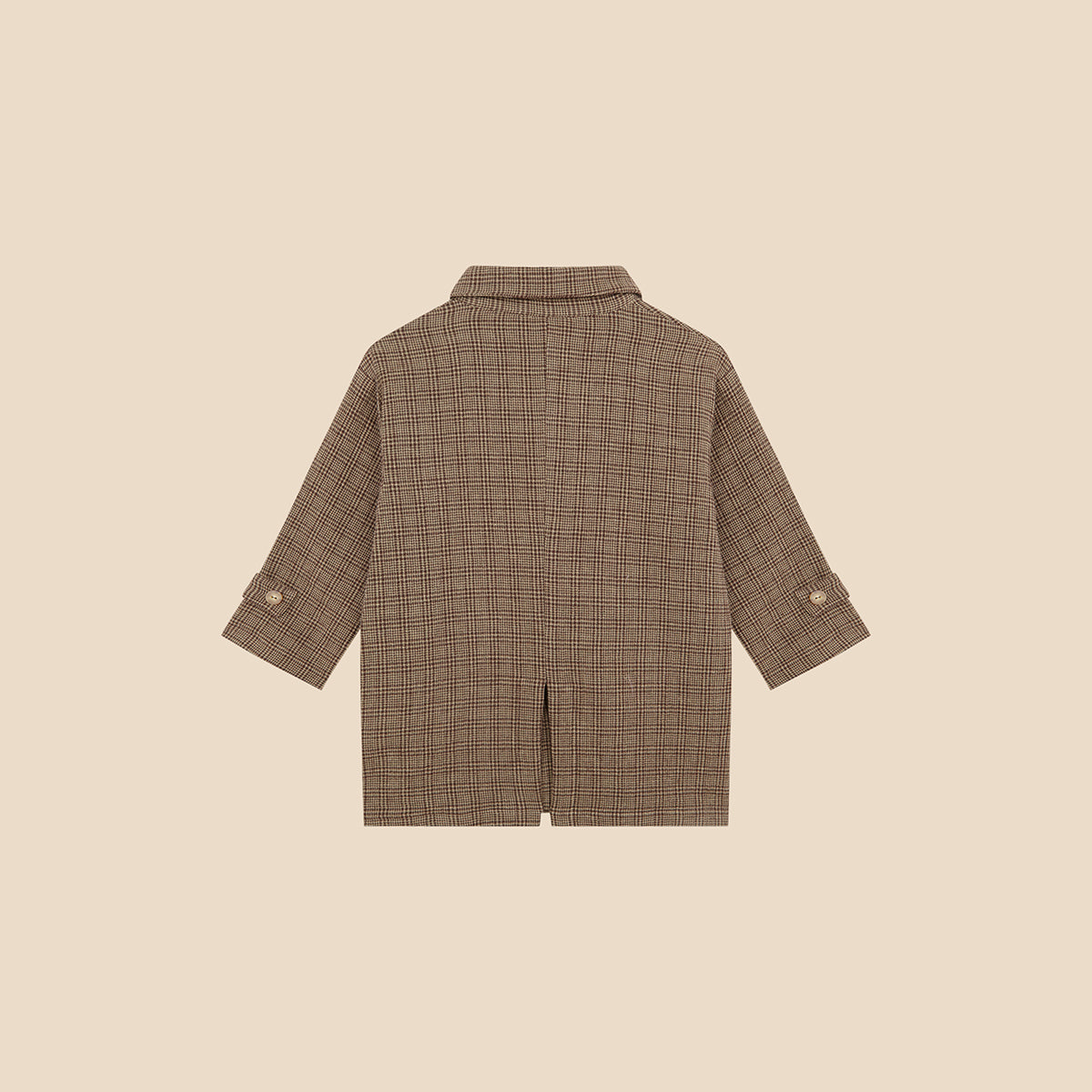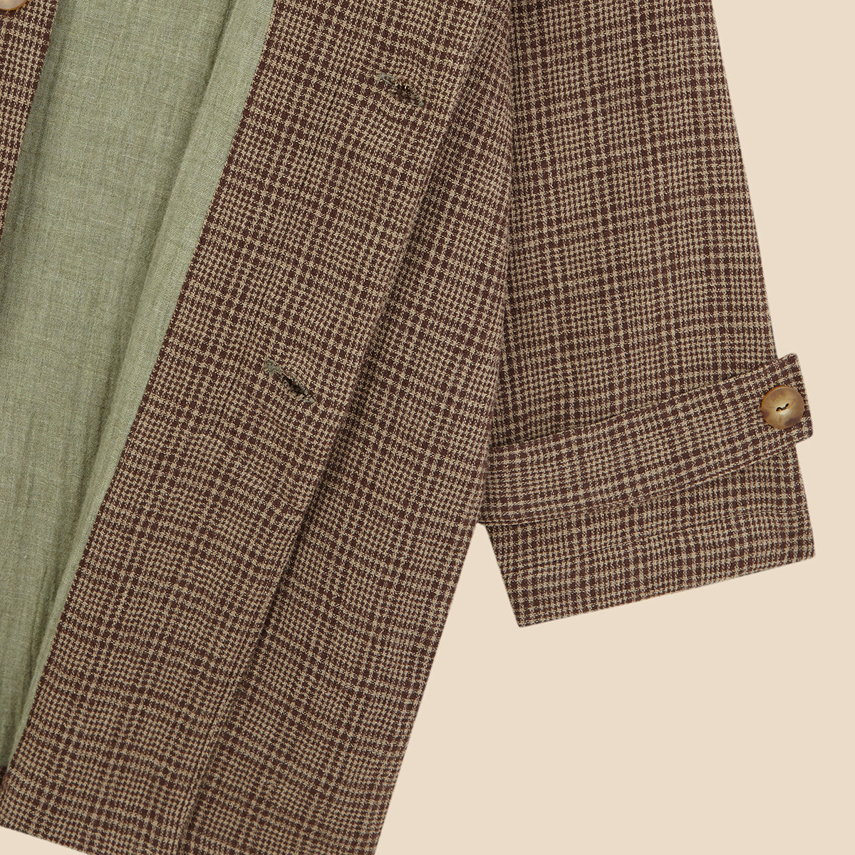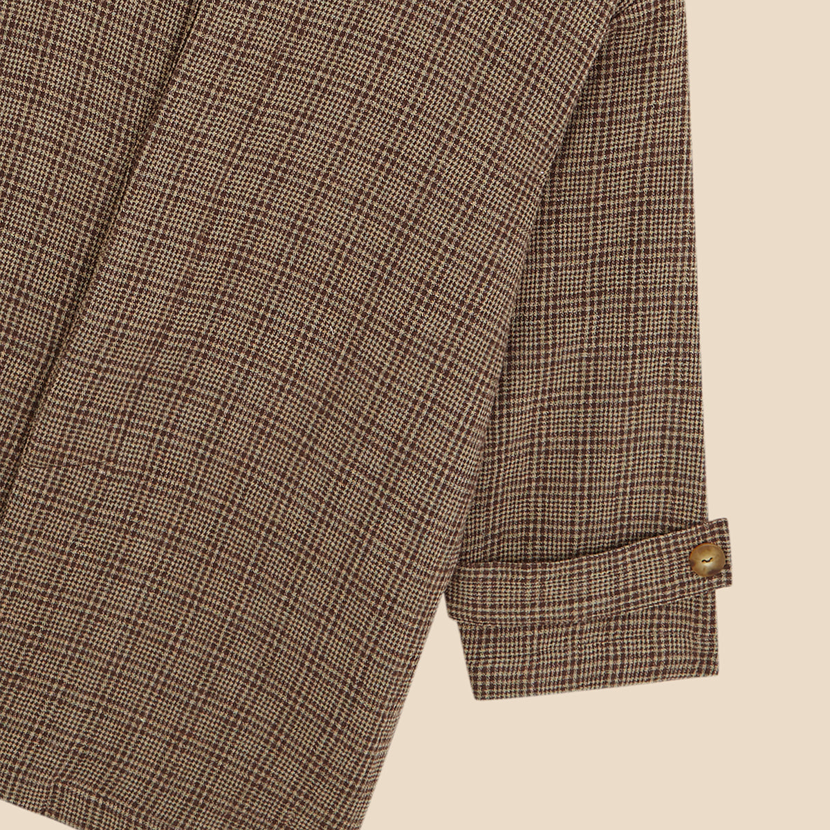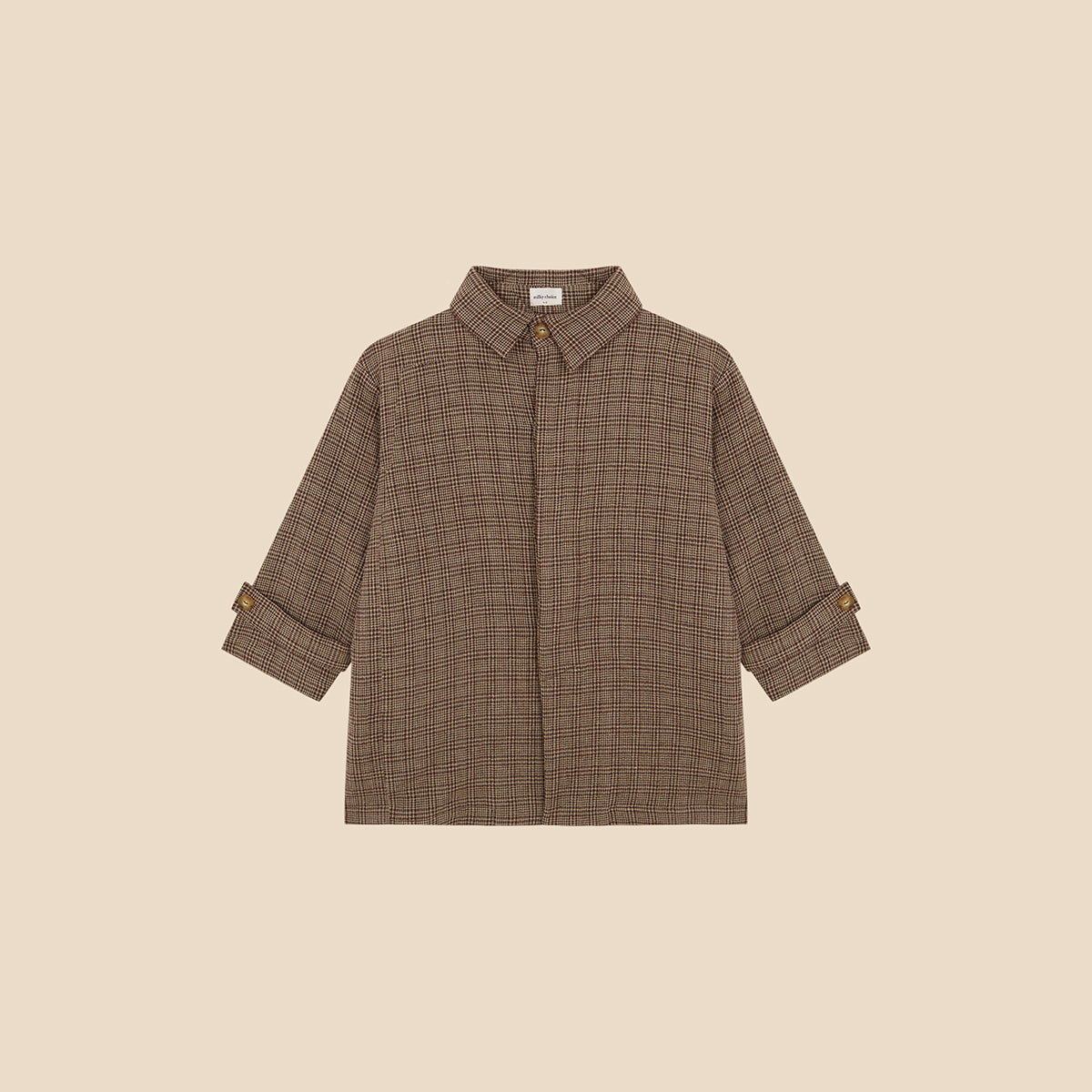 Timeless and effortlessly cool, the Trench Glen Brown is a unisex overshirt-style jacket crafted from soft Glen check cotton blend in shades of brown, beige and brick red, with a contrasting sage green lining.